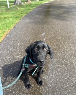 We start with short walks in low distraction areas and focus on core commands: sit, heel, here. We work on getting the pup to walk on the left side and sit when we stop walking.